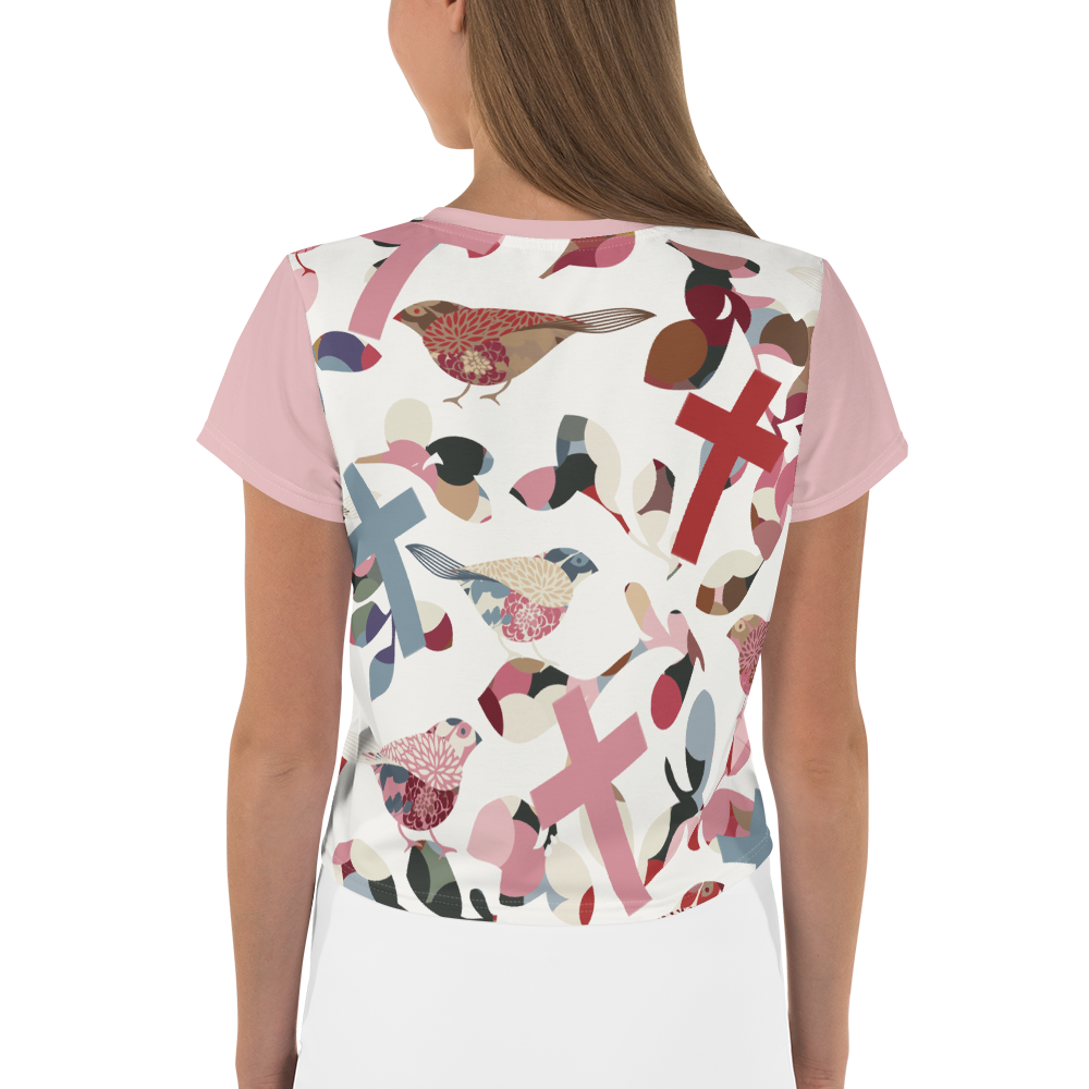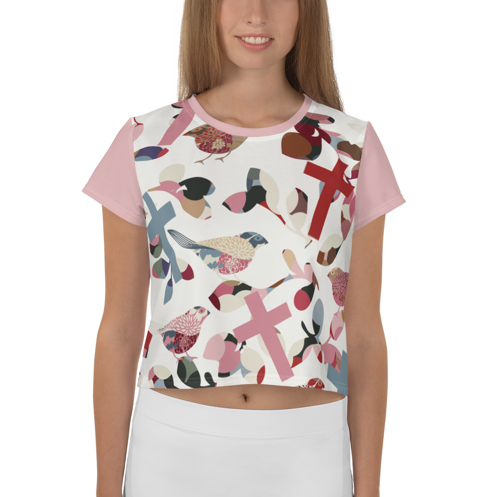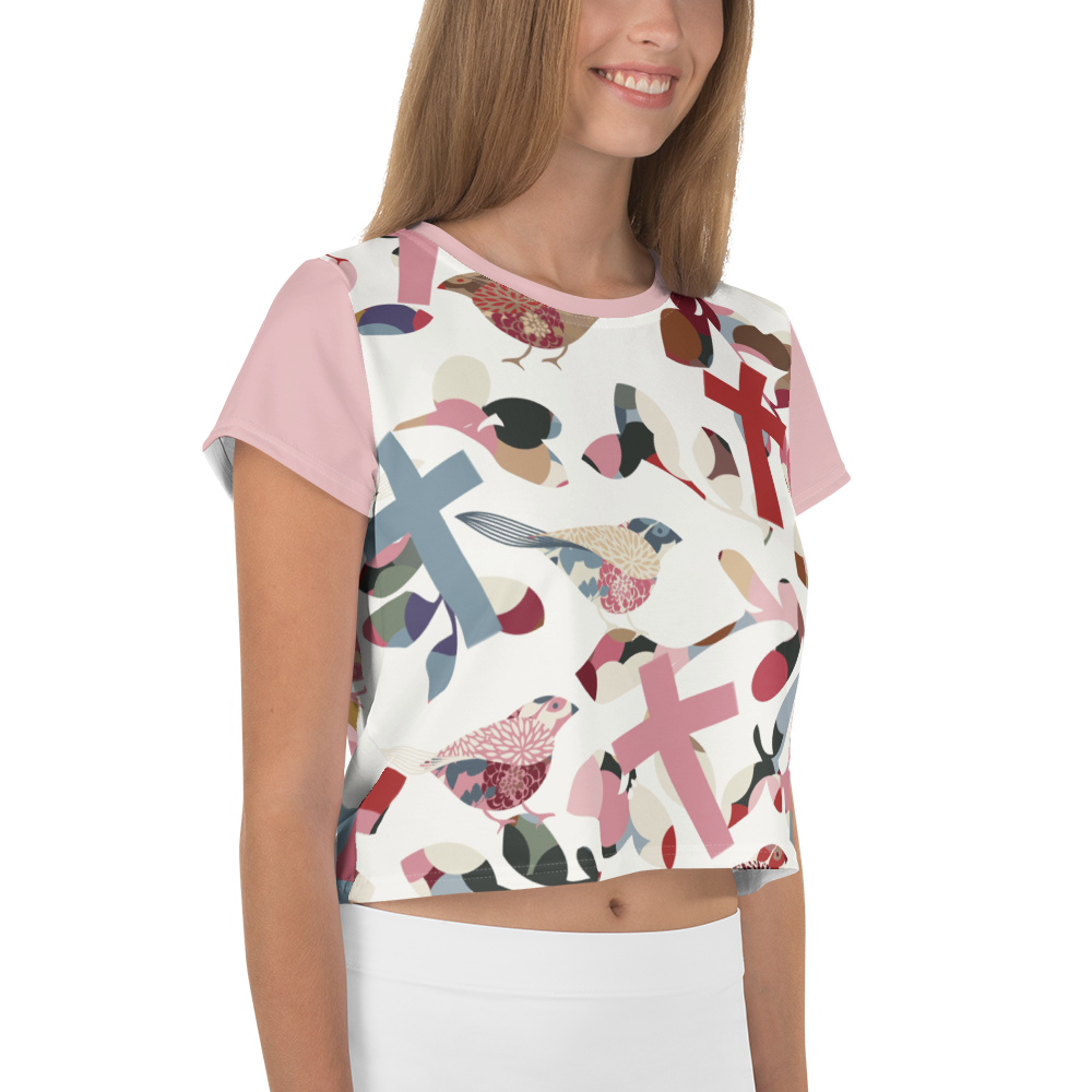 Looking for you next wardrobe favorite? Well, look no further because this Birds and Crosses crop tee is printed and sewn to fit you just right. To top that off, the original all-over design is definitely worth showing off, so don't hesitate to own one of these tees - they're meant to be adored.